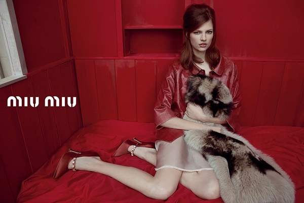 Ruby red walls and delicate pink flowers; tie-dyed furs casually slung over shoulders; duchesse satin dresses and dark denim overcoats: Miu Miu’s modern “dishabille” femme fatale is here, in these just-released images from the label’s Spring 2013 ad campaign.