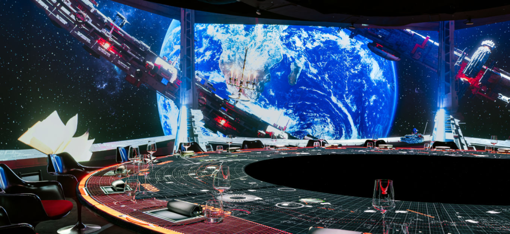 Upon arrival, guests are welcomed into a dimly lit, pink-toned bar where they can enjoy Champagne and exquisite amuse-bouches. The staff, dressed in futuristic attire, set the tone for the evening’s unique experience. The main dining area features a circular table accommodating up to 20 guests, surrounded by curved walls that serve as canvases for mesmerizing 3D multimedia projections. This setup transforms the room into an interactive art exhibition, with each course accompanied by visual narratives that complement the flavors on the plate.